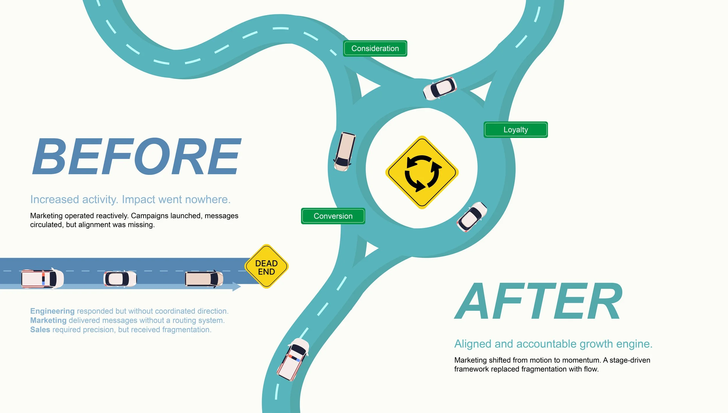 The roundabout became common language inside the organization. Teams understood where they were and what mattered next. Marketing guided progression. Engineering strengthened the value narrative earlier. Sales engagement became more precise.